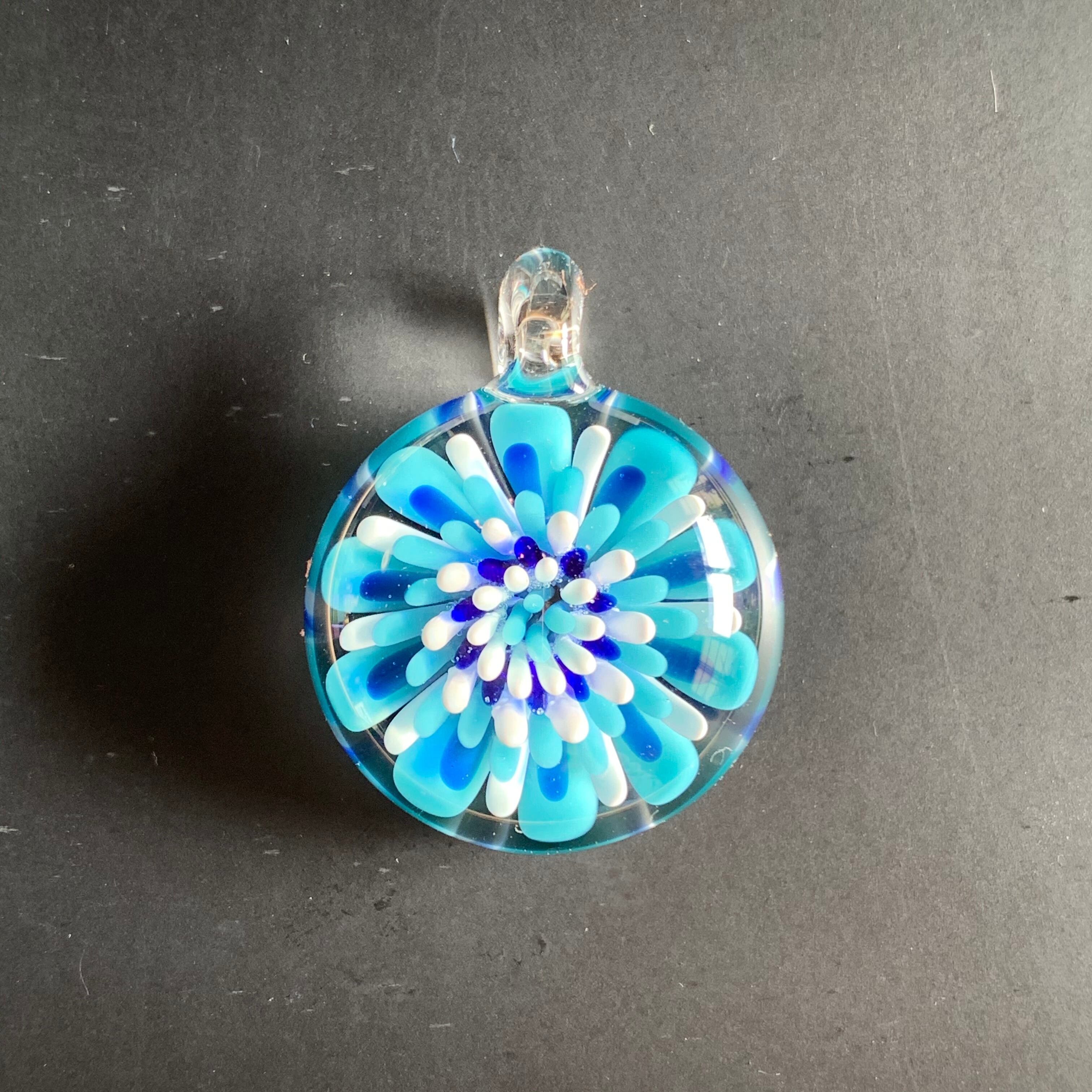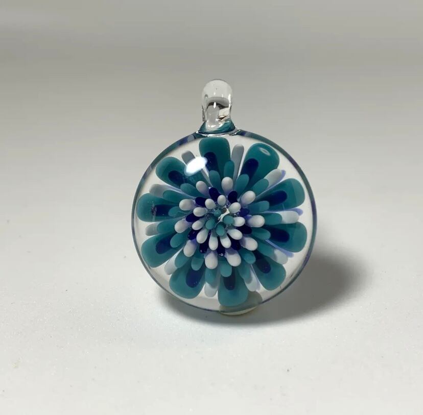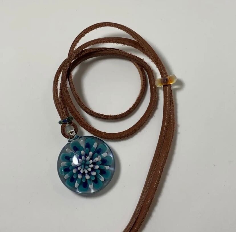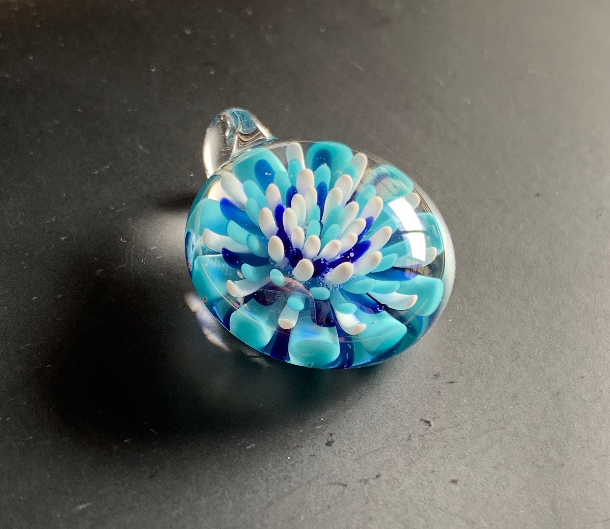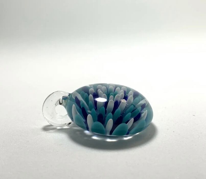 色ガラスで点を打ち、インプロージョンという技法でお花の様なペンダントを作りました。