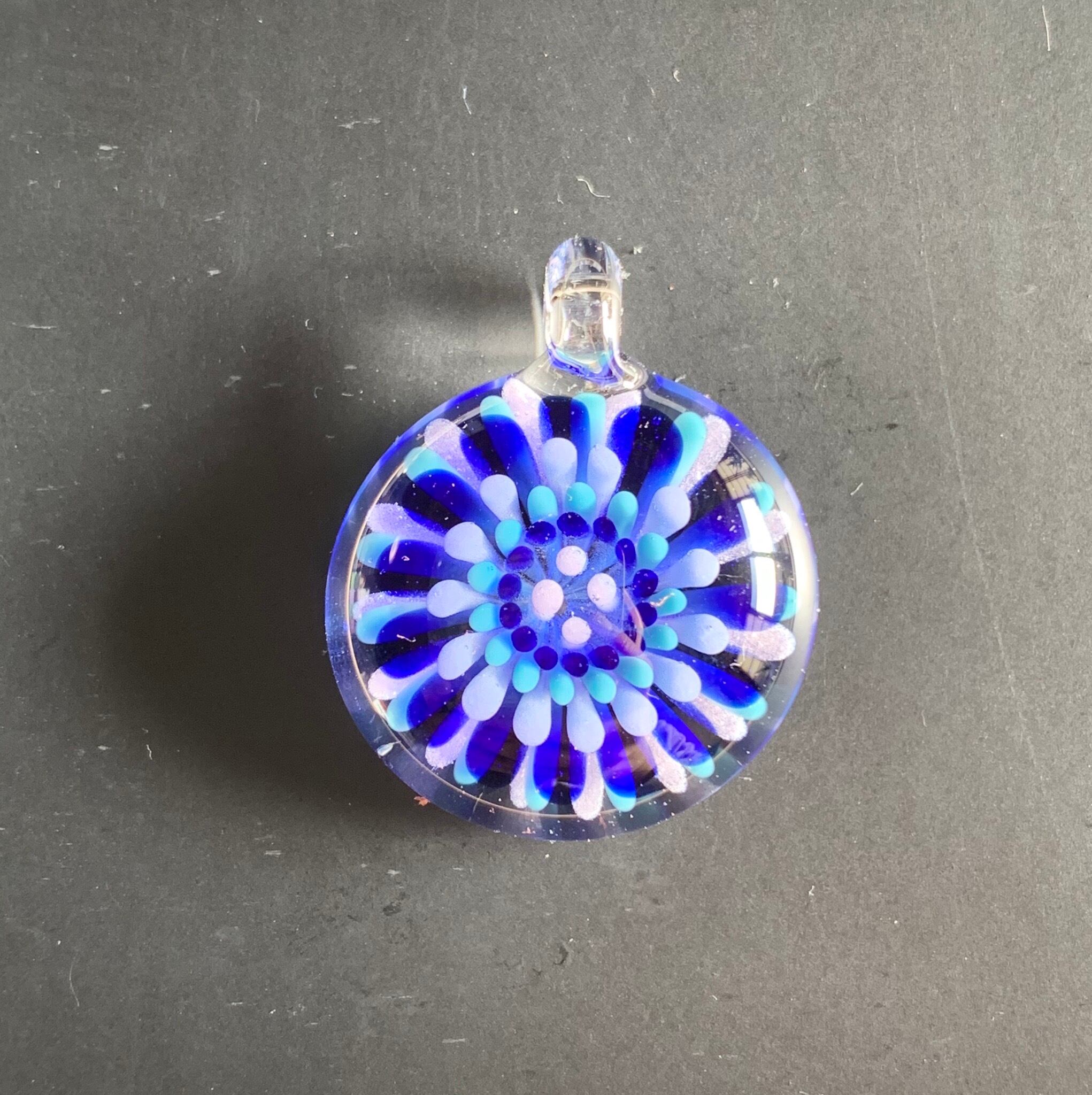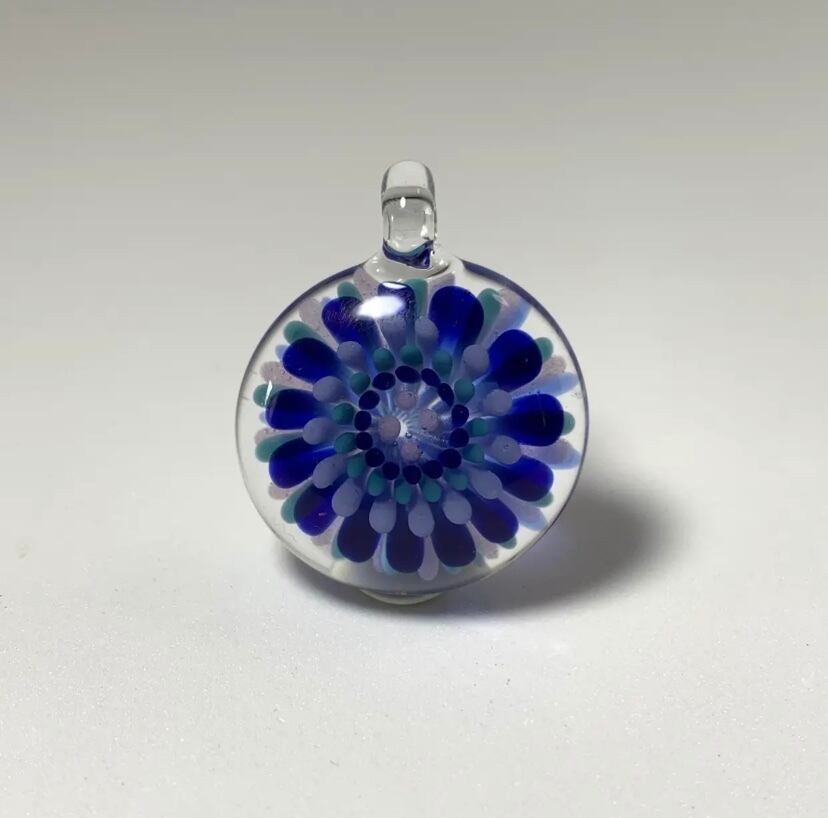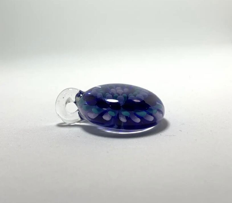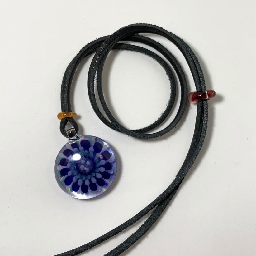 色ガラスで点を打ち、インプロージョンという技法でお花の様なペンダントを作りました。