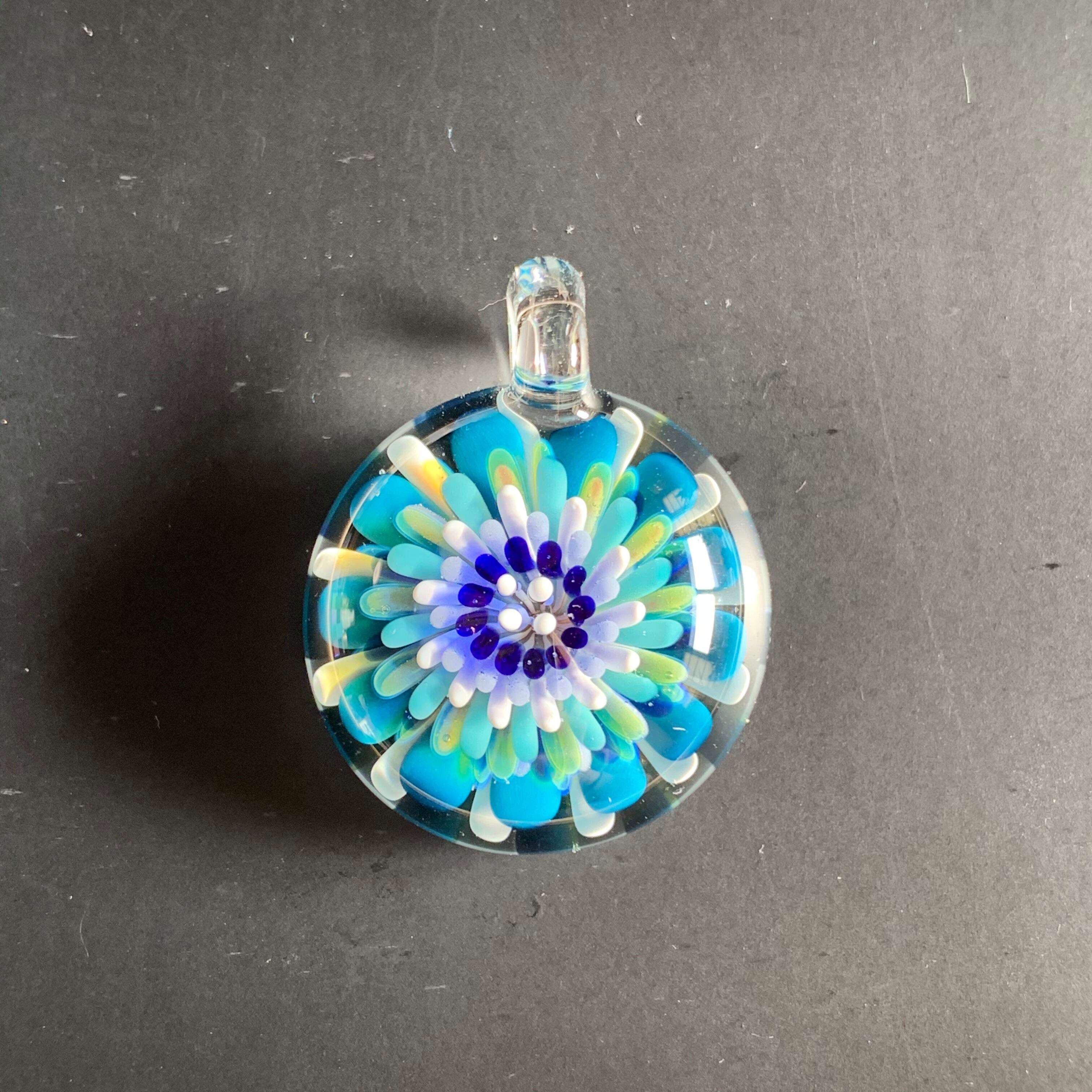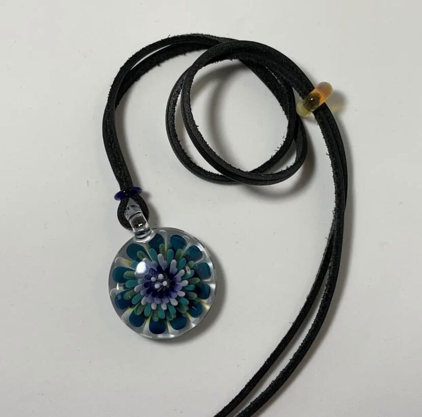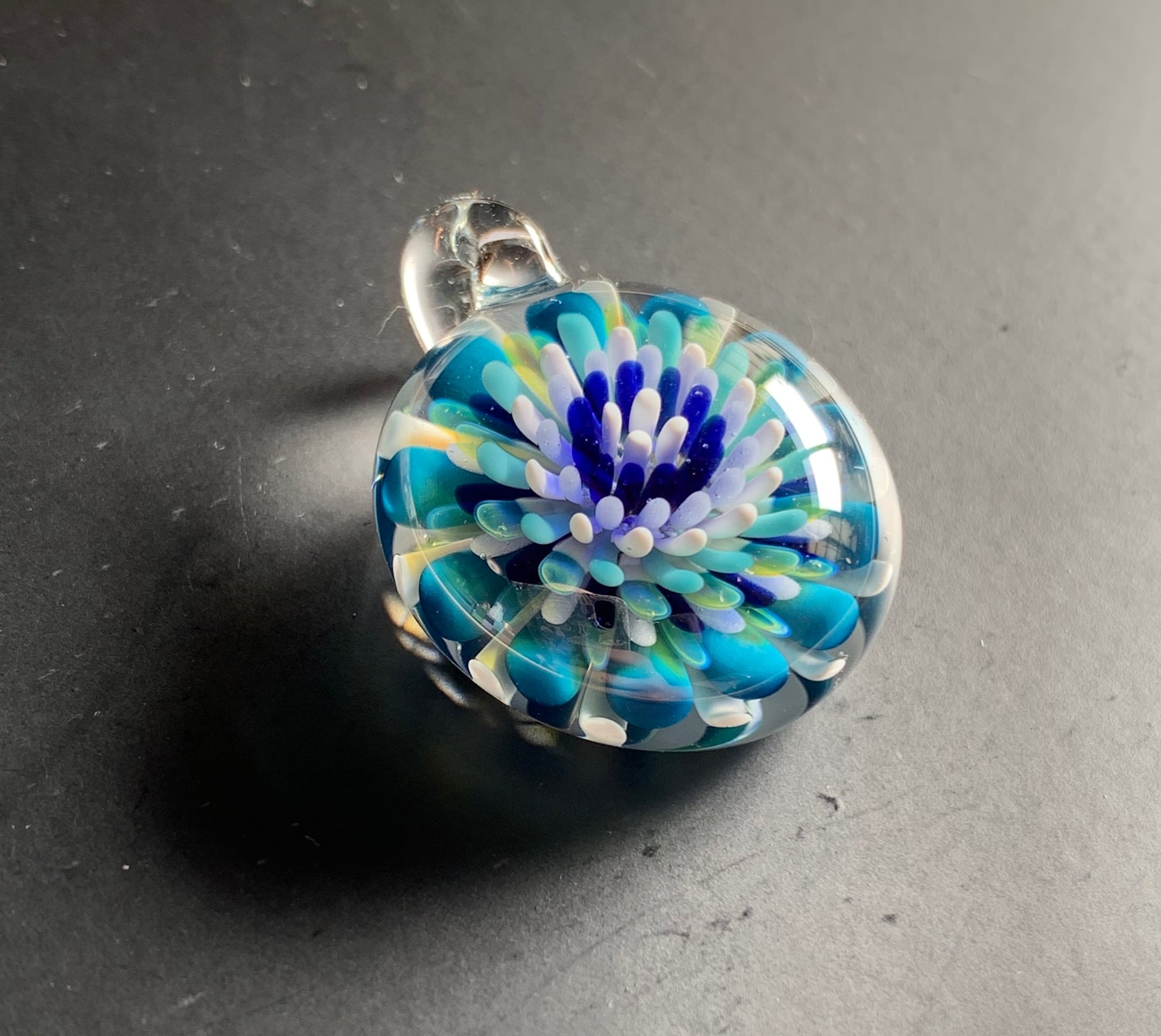 色ガラスで点を打ち、インプロージョンという技法でお花の様なペンダントを作りました。