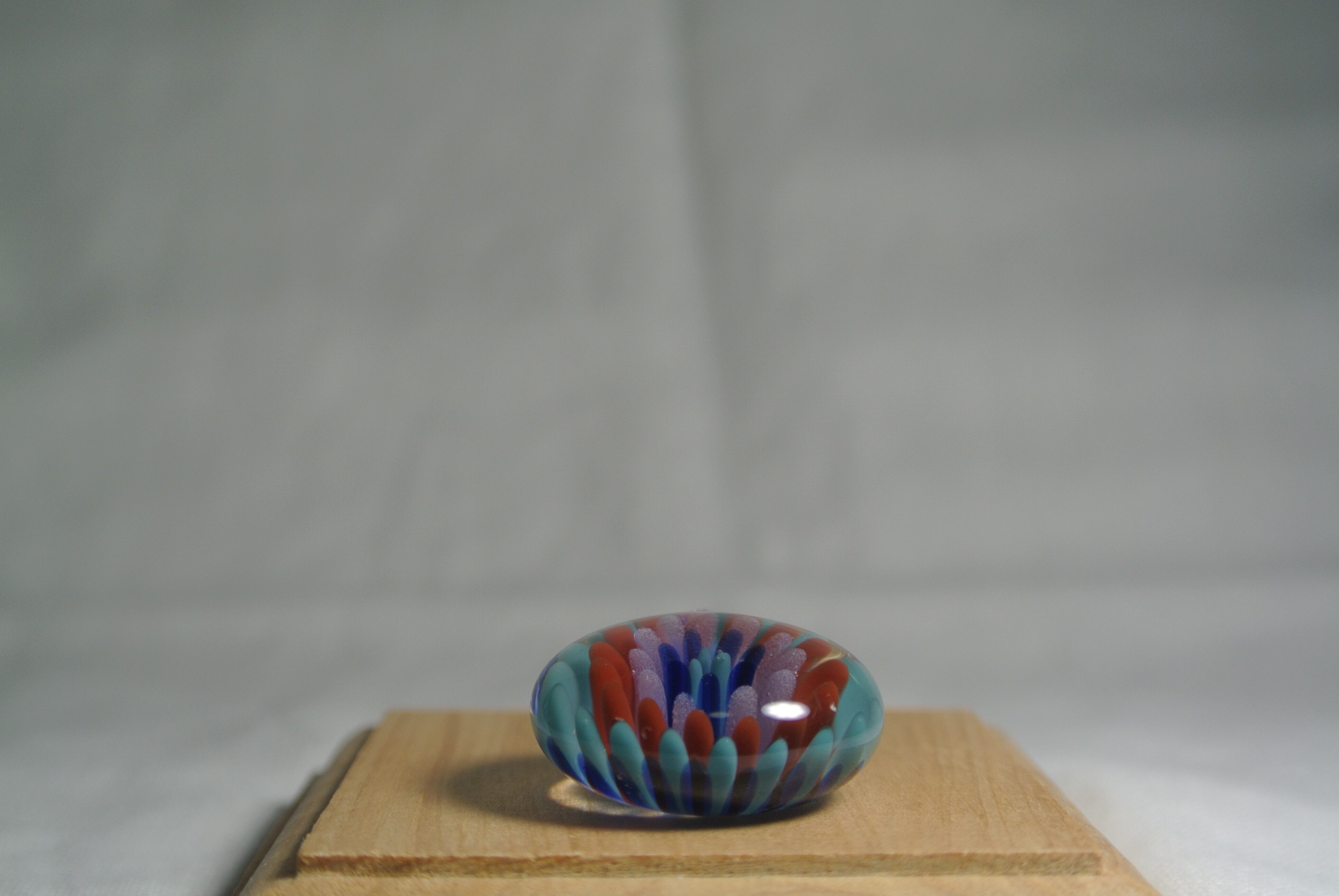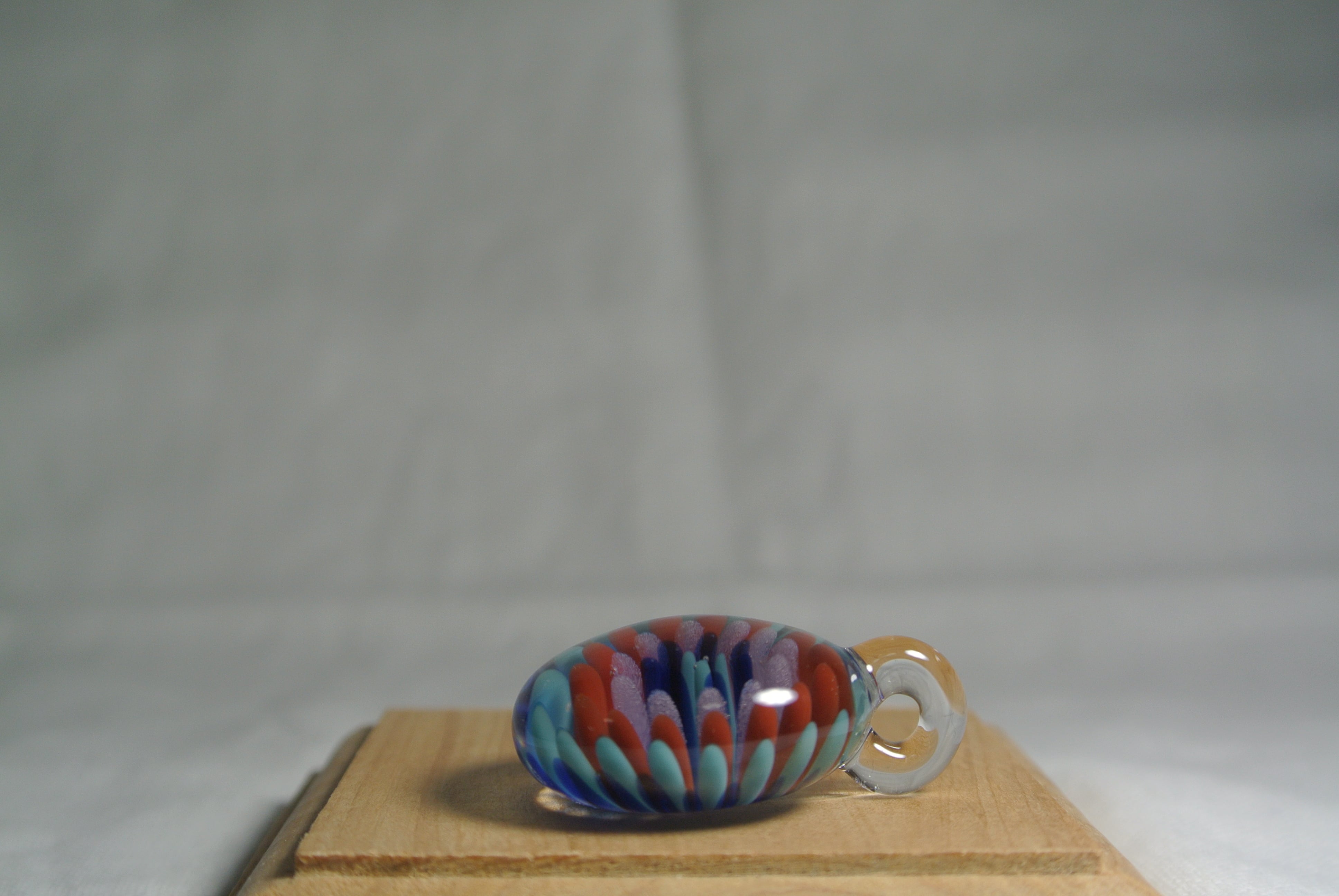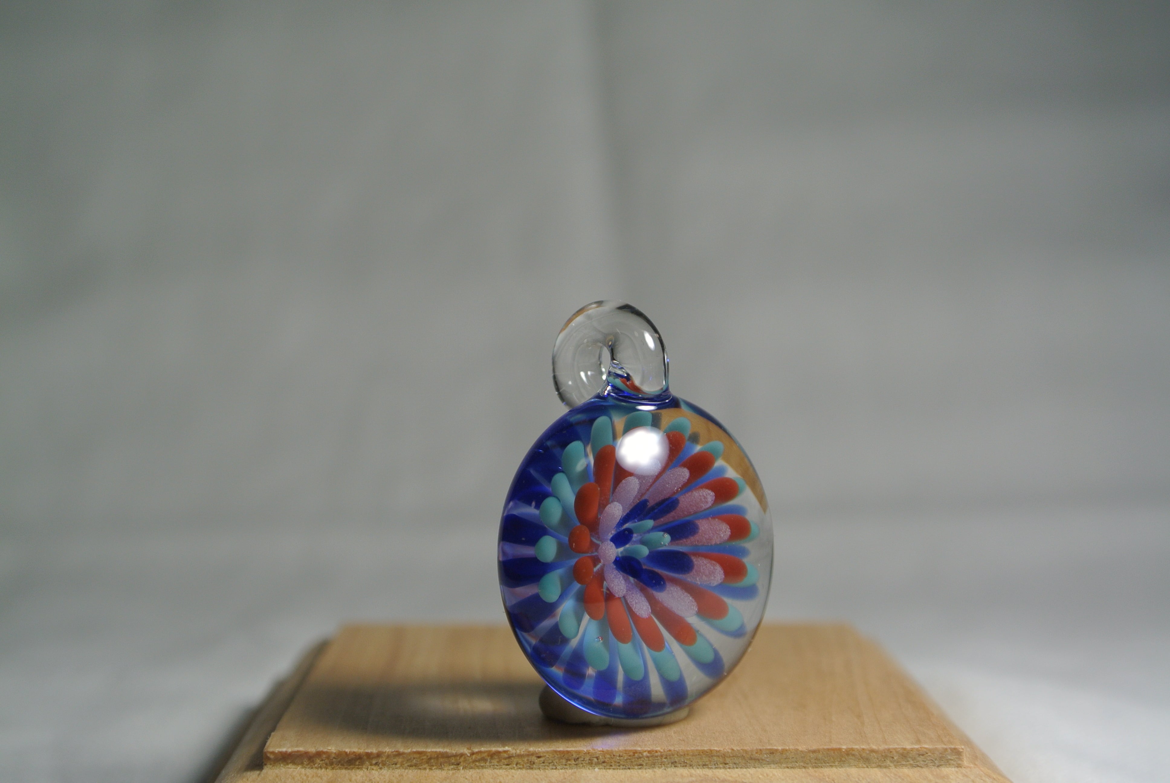 色ガラスで点を打ち、インプロージョンという技法でお花の様なペンダントを作りました。カラフルでポップなドットのペンダントです。